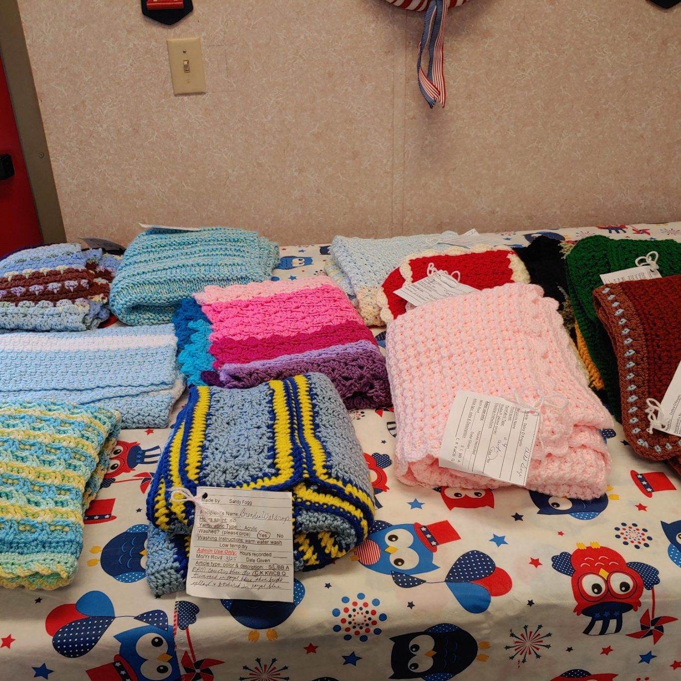 Since 2008–present, 2,300+ handmade shawls, lap robes, baby blankets, quilts, afghans, scarves, etc. have been created and given away.